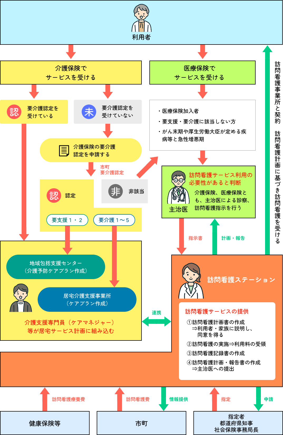 訪問看護は、すべての方が同じ制度で利用するわけではありません。病気の種類・年齢・状態によって、利用する保険(医療保険・介護保険)や自己負担額が異なります。